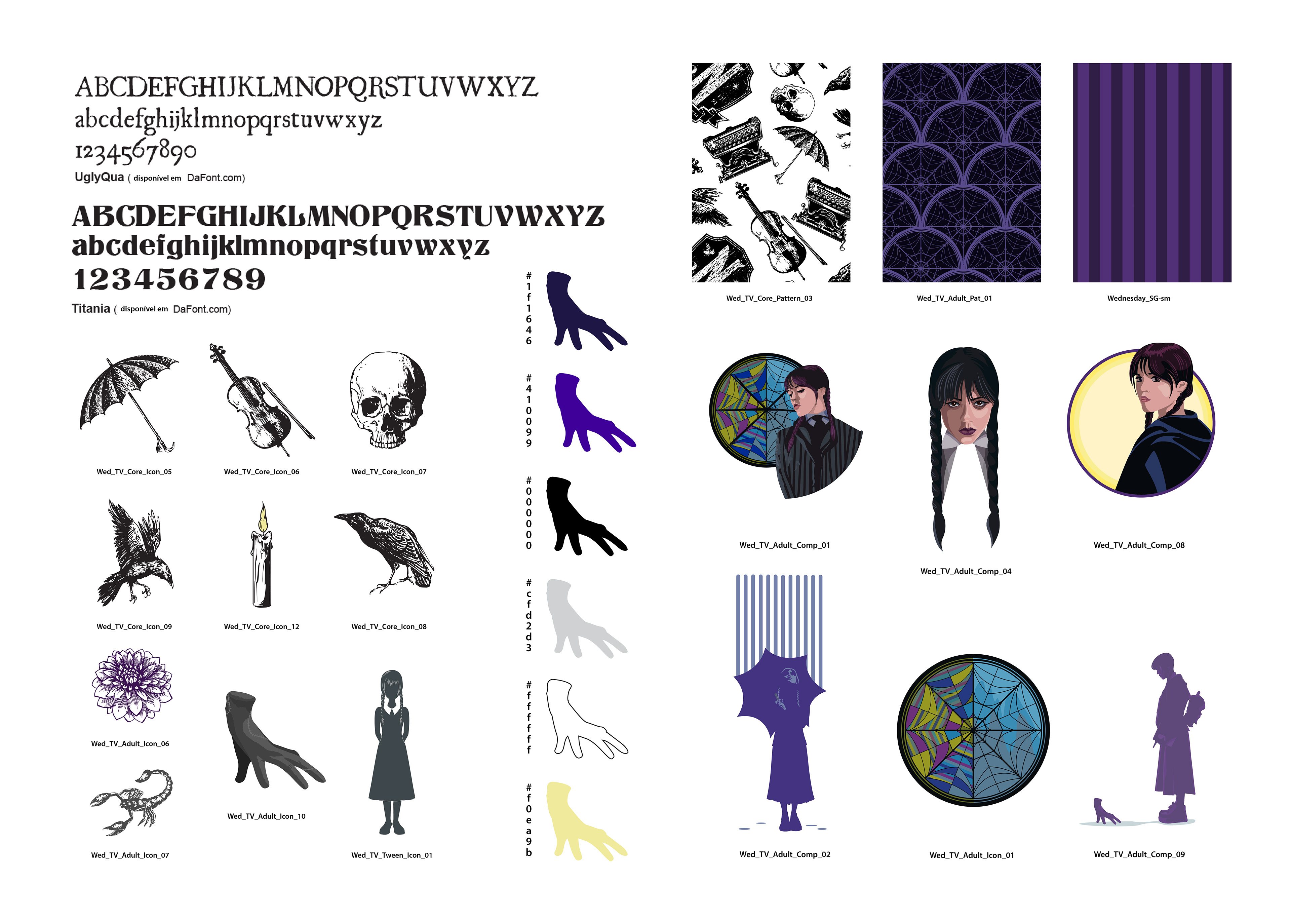 Elementos gráficos e cores selecionados do Manual Oficial da Netflix-Wandinha